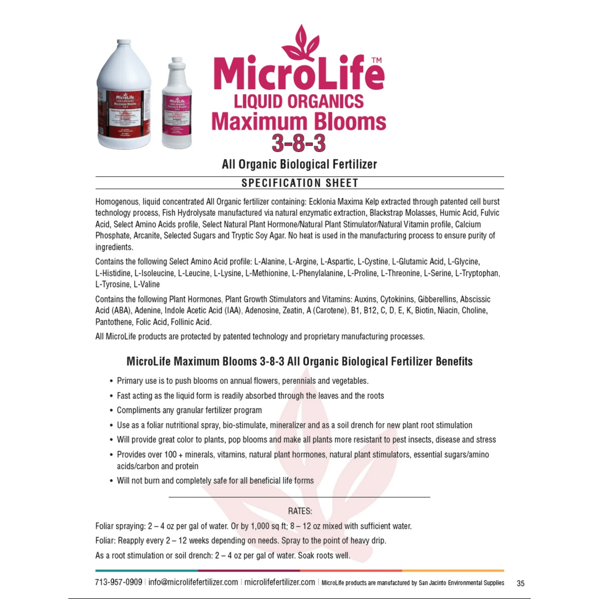 The ‘Organic Super Bloom’. Clients call it ‘Blooms in a Bottle’. This is another unique, high quality Organic product from MicroLife. We put in very select ingredients that will Pop • Pop • Pop blooms on plants. Via the Humic & Fulvic Acid delivery system contained in Maximum Blooms 3-8-3 your plants get a full load of proper nutrition plus special bloom stimulators. The plant takes these ingredients and uses them to make more buds. More buds, more blooms all the Organic way. Blooming plants are heavy feeders so use throughout the blooming season. Primary way is to spray the leaves every 1–2 weeks. Maximum Blooms makes a great root stimulator too!